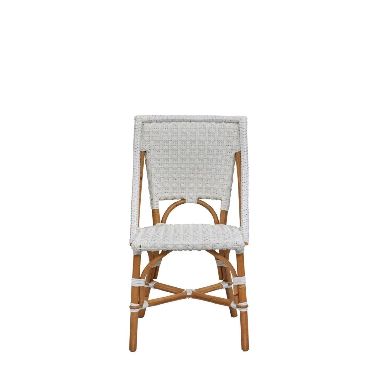 The set of 2 classic Parisian bistro chair, reinvented with a square back and star pattern. Each rattan frame is crafted by hand. The handwoven seats offer just enough give to keep things comfortable. They’re also incredibly durable and a breeze to clean, making them fabulously family-friendly and great for dining spaces. SOLD IN PAIRS ONLY. Available in White and Navy/White. White shown.